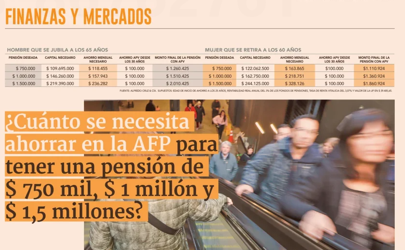 Un ejercicio realizado por la consultora previsional Alfredo Cruz & Cía., determinó cuánto ahorro requiere una persona para obtener una pensión de $ 750 mil, $ 1 millón y $ 1,5 millones.