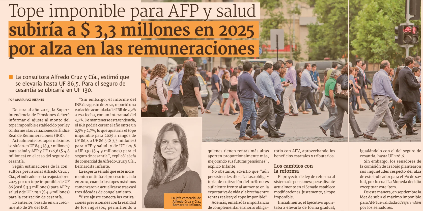 En este contexto, nuestras estimaciones iniciales proyectan un tope imponible de 86 UF para AFP y salud y de 129,1 UF para el Seguro de Cesantía, basándonos en un crecimiento del 2% del IRR. Sin embargo, el informe del INE de agosto de 2024 reporta una variación acumulada del IRR de 2,2% a esa fecha, con un interanual del 3,8%. De mantenerse esta tendencia, el IRR podría cerrar el año entre un 2,5% y 2,7%, lo que ajustaría el tope imponible de 2025 a rangos de 86,4 UF a 86,5 UF para AFP y salud, y de 129,8 UF a 130 UF para el Seguro de Cesantía.