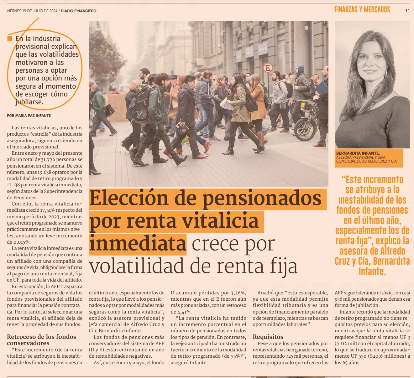 “Este incremento (de la renta vitalicia) se atribuye a la inestabilidad de los fondos de pensiones en el último año, especialmente los de renta fija, lo que llevó a los pensionados a optar por modalidades más seguras como la renta vitalicia”, explicó la asesora previsional y jefa comercial de Alfredo Cruz y Cía, Bernardita Infante.