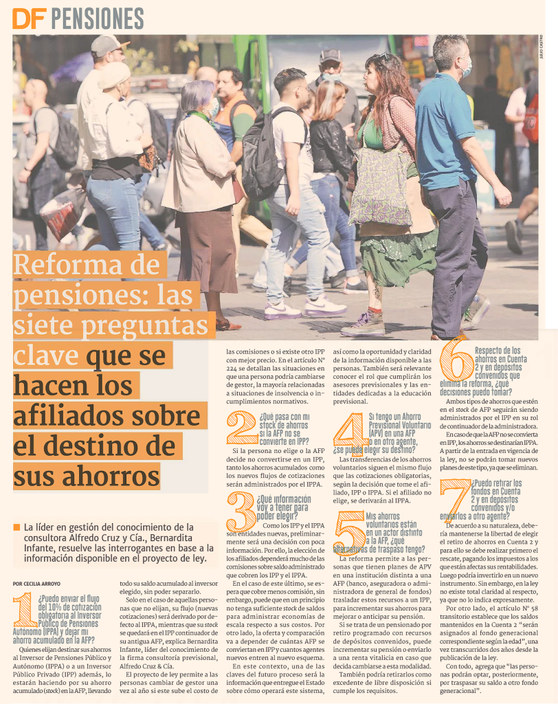 Bernardita Infante, experta previsional y Líder de Gestión del Conocimiento de nuestra Consultora colaboró con Diario Financiero en una interesante nota que resume las principales inquietudes que hemos recibido de todos nuestros clientes, respecto al futuro de sus ahorros con el actual proyecto de Reforma Previsional.