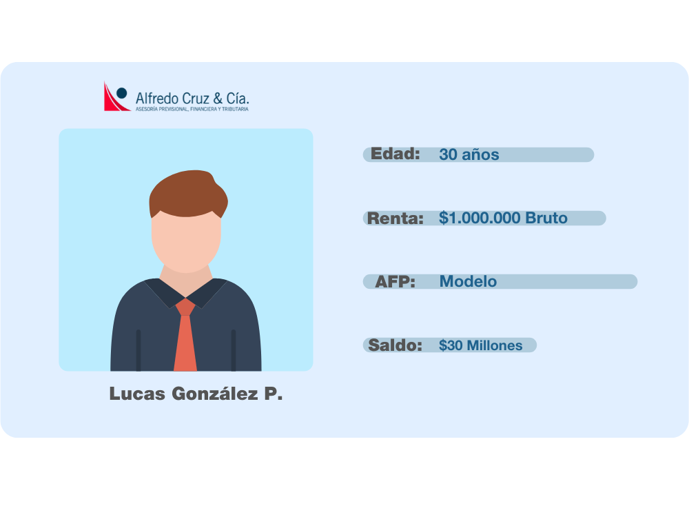 Lucas tiene 30 años, una renta imponible de $1.000.000 y un saldo en su cuenta de AFP de $30.000.000. Sus fondos están en el tipo B.