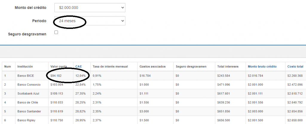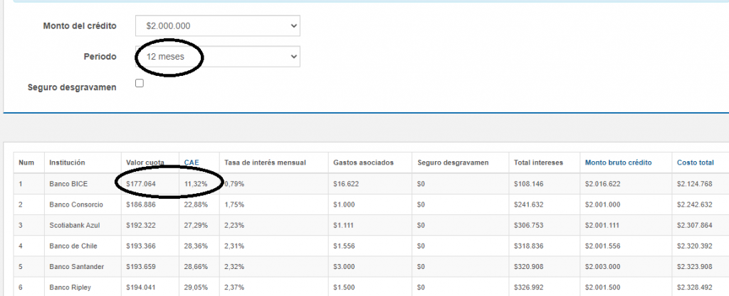 Simulamos un crédito de consumo de 2 millones de pesos a un plazo de 12 meses en varias instituciones. El Banco 1 nos arroja una CAE del 11,32% con una cuota mensual de $177.064.-