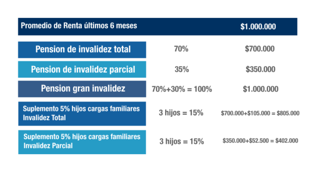 El monto de las pensiones de invalidez parcial equivale a un 35% del sueldo base, que es el promedio de las remuneraciones o rentas imponibles, percibidas por el trabajador durante los seis meses anteriores a la fecha del accidente del trabajo o a la fecha en que la enfermedad fue diagnosticada.