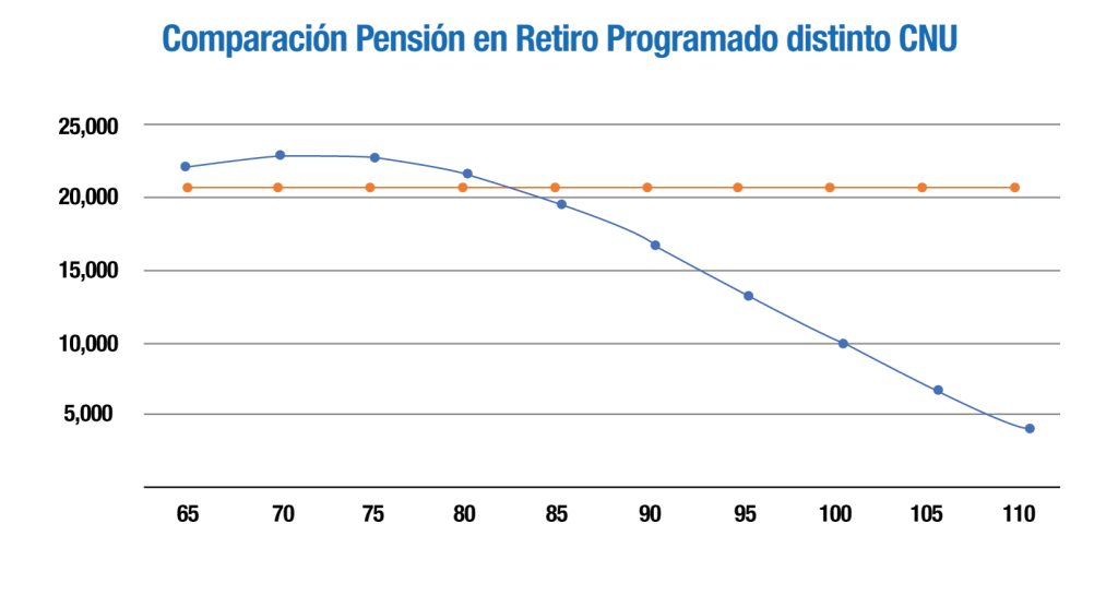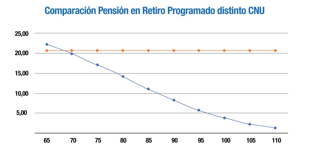 En este caso podemos observar que las pensiones incluso pueden aumentar y luego el descenso de la curva del Retiro Programado es menos pronunciada.