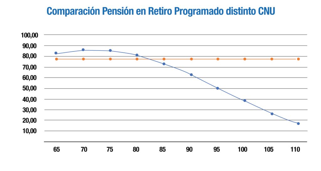 El CNU es el resultado de una formula matemática, estadística y financiera que combina tabla de expectativa de vida del pensionable y su grupo familiar de beneficiarios, con la tasa de interés que en caso del retiro programado es una combinación de tasas o “vector de tasas”(hoy de 4,01%) . El impacto que tiene esta tasa es que en la medida que ella crece o aumenta, suben las pensiones y viceversa. Dicha tasa corresponde a aquella resultante de ponderar por un 80% la tasa de interés equivalente derivada de un vector de tasas de interés y por un 20% la tasa de retorno anual promedio de los Fondos de Pensiones C, D y E en los últimos 10 años (20%, 60% y 20% respectivamente)