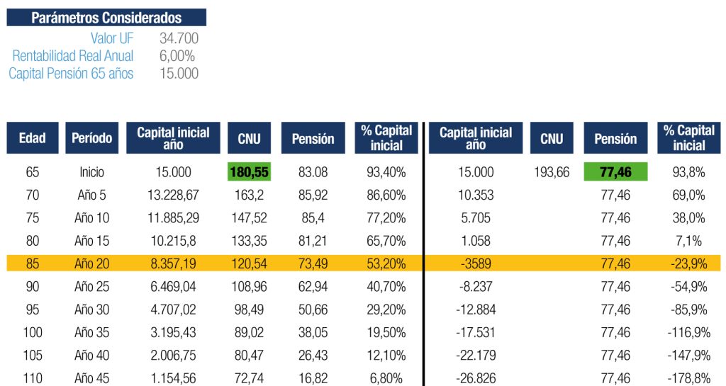 Como vimos al comienzo, la característica más relevante del Retiro Programado es la heredabilidad de los fondos que queden. Entonces, en el caso expuesto, si el pensionado no tiene beneficiarios de pensión de sobrevivencia, genera automáticamente una herencia de 8.000 UF aprox.