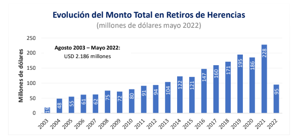 b) Herencias pagadas por las AFP desde 2003 a mayo 2022. Monto total en USD y Monto promedio por retiros en pesos.