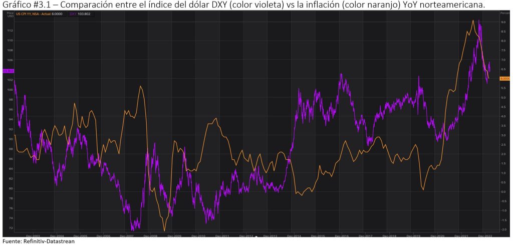 En relación al siguiente gráfico, podemos ver la relación que existe entre la inflación anualizada de Estados Unidos y el valor del índice del dólar DXY. Queda de manifiesto que, ante un dólar fuerte, sube la inflación y ante un dólar débil, ésta cae.