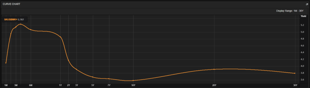 Al observar la curva de rendimiento, podemos notar que la tasa de interés a 1 mes se sitúa en un 4,10%, mientras que la tasa a 4 meses alcanza el 5,20%, lo que representa un desequilibrio de corto plazo. Normalmente, la curva de rendimiento presenta una forma más lineal cuando es positiva o negativa.
